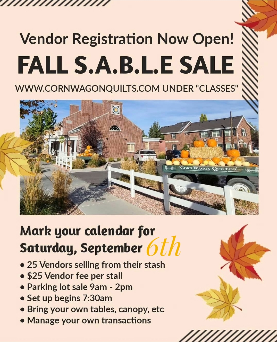 S.A.B.L.E stands for Stash Accumulated Beyond Life Expectancy. It's real. We know from experience and we want to help you out! Saturday, September 6th we are hosting a S.A.B.L.E Sale in our Corn Wagon Too parking lot! Rent a parking stall for $25 and set up shop 9 a.m. - 2 p.m. with fabric, patterns, kits, notions - - anything quilting related that you're ready to part with. You set your own prices and manage your own transactions for your own S.A.B.L.E Sale! You can even get a group of friends who are also affected by S.A.B.L.E. syndrome and share a space! We'll get the word out! You bring the goods!