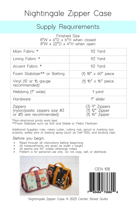 In this class we will be making the Nightingale Zipper Case as shown by the pattern. Any adjustments you wish to make are your responsibility to plan and sew outside of class.