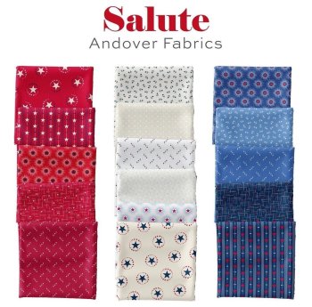 As for finding just the right red, white and blue prints for your project, may we suggest the whimsical Star-Spangled Beach collection (above) by Studio E for a party of a picnic quilt. Looking for something a little more traditional? Try the Salute collection (below) by Andover for some classic Americana.