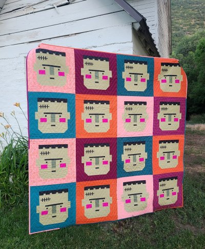 You've likely seen Lella Boutique's adorable Frank pillow pattern but have you seen him in quilt form? Cymoni Whatcott made 16 Frank blocks, complete with stitches, to create this 68" x 68" Halloween quilt in bold, modern colors. Nothing to be afraid of -- traditional piecing methods make him frightfully fun to sew up! You'll be happy to know we have a few KITS for Frank! They include the original pillow pattern and yardage as shown for making all 16 blocks and scrappy binding. We have also included the steps Cymoni took to cut and piece her quilt.
