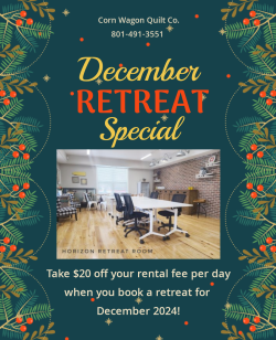 Book a Retreat in December & Save!Step away from the hustle and bustle of the holiday season for a bit of sewing relief. We have retreat rooms available for you to host your own holiday sewing party! It's an excellent place to get some secret Christmas sewing done. Host a retreat before the end of the year and we'll take $20 off your rental fee per day during the month of December. This special offer does not apply to retreats already booked. Retreat discounts don't happen often so take advantage of this chance to get your quilt gang together and sew!