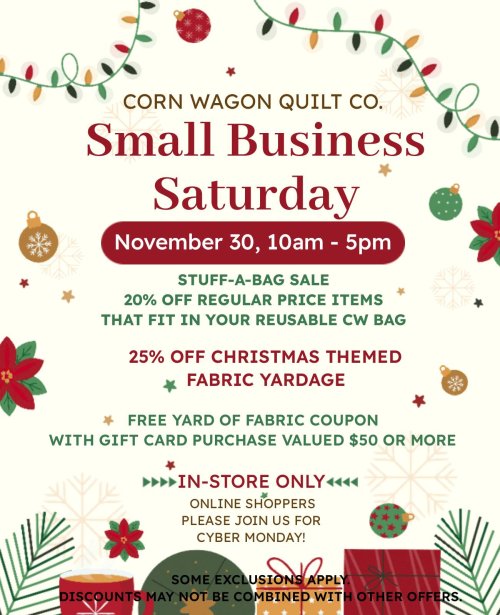 Small Business Saturday has become an important day for supporting local businesses as we kick off the greatest shopping days of the year. Big commercials for big stores make it easy to overlook the little guys for Black Friday shopping sprees. That's where Small Business Saturday comes into play. It's a day dedicated to supporting the locally owned businesses that make our community unique and strengthen our local economy while providing specialized service. We're proud to be a part of it and we look forward to supporting other local shops as we enter the season of giving. We have some great offers going on this Saturday to encourage you to "shop small" at Corn Wagon Quilt Co. tomorrow!