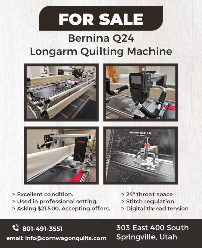 We've lowered the price from $21,500 to $19,999! Your quilt goals for 2025 could include quilting on your own Bernina longarm machine. Used professionally here at the shop, you can rest assured it has been well cared for and with a brand like Bernina, you can count on a solid machine. Dave's Bernina offers professional take-down, delivery and set-up for $2000 and we're willing to pay for half of that fee to ensure it arrives in your home safely. Call the shop to schedule a time to come in and take a look!
