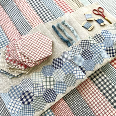 Speaking of distorting the weave... Because many wovens feature stripes and plaids, you may want to be careful to cut along the grain of fabric, keeping lines straight. When we cut woven fabrics from the bolt at Corn Wagon, we always use scissors and follow the crossgrain, giving you the ability to work with straight lines, if you so choose. Sometimes wovens need a bit of straightening as they tend to "telescope" when loaded on and off the bolt. This can be accomplished through your starching and pressing process. Do your woven lines need to be straight in your quilt piecing? Well, that's a personal preference. How fun are the plaid hexies above, made from French General's new Woven Ginghams!