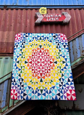 An optional kit is available on a first come first serve basis for this quilt as shown in the image above. It includes the pattern and features Tula Pink prints and a variety of solids for backgrounds. Binding is included. Finished size: 59" x 59."