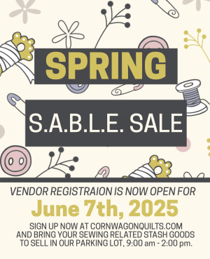 S.A.B.L.E. stands for Stash Accumulated Beyond Life Expectancy. It's real. We know from experience and we want to help you out! Saturday, June 7, 2025 we are hosting a SPRING S.A.B.L.E. SALE in our Corn Wagon Too parking lot! Rent a parking stall for $25 and set up shop 9 a.m. - 2 p.m. with fabric, patterns, kits, notions - - anything quilting related that you're willing to part with. You set your own prices and manage your own transactions for your own Destash Sale! You can even get a group of friends who are also affected by S.A.B.L.E. syndrome and share a space! This spring, we'll welcome the wood-fired Pizza Friendzee truck back -- YUM! We'll get the word out! You bring the goods! Reserve your vendor space here.