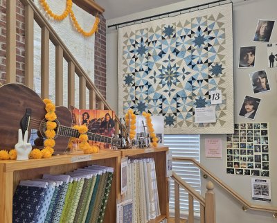 And finally (Ringo, can we have a drum roll, please?), it's time to reveal our exclusive 2025 Shop Hop quilt! Designed by Ramona Sorensen, Lucy's Diamond Sky features rows of traditionally pieced stars and diamonds. We chose to work with Art Gallery Pure Solids in Suzy Quilts' signature palette that lends a subtle 60's vintage vibe. You'll receive this pattern free when you visit the shop between April 25th and May 3rd and we have kits available while supplies last! Thanks for joining us here on CWQC, Springville where it's all Beatles, ALL the time!