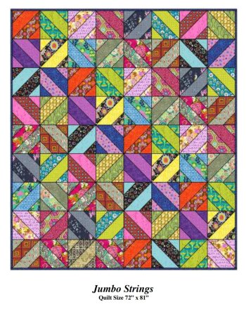 Time for another FREE PDF pattern release! The next installment of our Quilt of the Month series, Jumbo Strings is a generously sized, 72" x 81" throw quilt that's fat quarter friendly and easy to make! Large half square triangles are finished with simple stitch-and-flip corners. The layout creates a striking, string-style mosaic of energetic diamond shapes.