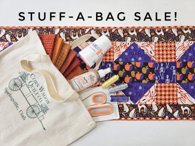 Tomorrow, Saturday, August 30th is a fifth Saturday. You know what that means? Time for another Stuff-a-Bag Sale! Bring in your reusable, cotton Corn Wagon Quilt Co. bag and receive 20% off any regular priced items you can "stuff" inside. Don't have a bag yet? Purchase one for $8 and reuse it every 5th Saturday for the Stuff-a-Bag Sale! It's a great way to stock up on the notions you need, grab some of that new fabric you've been waiting for, or pick up the kit you've had your eye on. If it fits in your Corn Wagon bag, it's 20% off tomorrow!