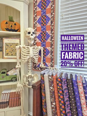 Next, Bone-ita discovered our Halloween fabric's on sale 20% off!She's especially fond of the Sleepy Hollows collection by Amy MacCready for Cloud 9 Fabrics. Ghosts, cats, skeletons and mod autumn florals give a nod to the 60's in spooktacular fashion. High-quality organic cotton isn't scary to sew with at all! Kathe Torgerson pieced this cute Built to Order Table Runner in this line. We have kits, but only a couple left! You can download the pattern for free from American Patchwork and Quilting here.