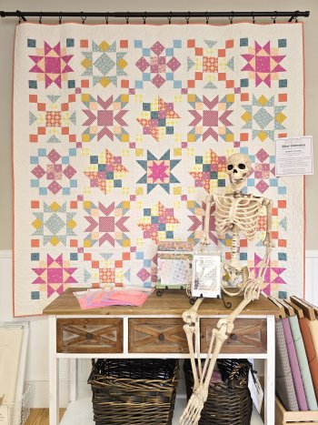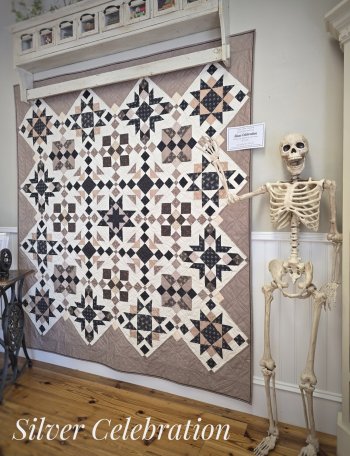 Bone-ita is back just in time for Halloween! When she first arrived, her jaw dropped (almost right off) at the sight of our finished Silver Celebration Mystery Sampler. 25 beautiful blocks commemorating 25 years of quilting at Corn Wagon have come together over the past 10 months and it's been a delight to see everyone's progress. Bone-ita was sad to have missed out while she's been away. If you too are wishing you had been part of the celebration, we are happy to announce that the complete pattern is now available to purchase at the shop and online here. You can even access our YouTube tutorials for valuable tips and tricks as well as pattern support! Count Bone-ita in!