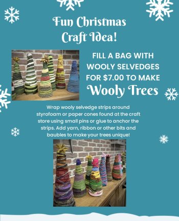 Speaking of something to make over the holidays... our Handstitching Club made these adorable wooly trees and you can too! Fill a bag with hand-dyed wool selvedges for just $7.00 at the shop. Wrap the strips around styrofoam or paper cones found at the craft store using small pins or glue to anchor each strip. You could even add colorful yarn, trim or other bits and baubles to make your trees unique!