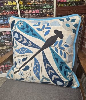 While we're talking about wool applique, I need to show you this pretty pillow that Marianne Michaels just finished. Nordic Wings is a generous 22" x 22" pillow design by Primitive Gatherings. Marianne's hand-dyed wool in an array of blues adds to the Scandinavian feel. We have kits ready for you that include the pattern, wool pieces for applique and cotton flannel for the background and pillow backing.