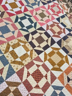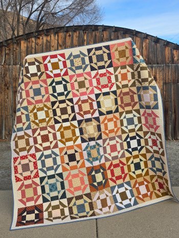 The Shoo-Dash quilt shown above combines two of the earliest, most recognizable quilt designs from the past into one simply beautiful block. Karen Averett chose to continue this nod to quilt history by selecting an array of reproduction prints for piecing this 87" x 87" fat quarter-friendly quilt by Sweet Jane's Quilting Design. E2E quilting by Chelsea Hilton in a Daisy motif is just the thing! We have put together kits featuring 49 fat quarters for you to mix and match. The result is a quilt that looks as if it were found in great-grandmother's attic, an heirloom from an era of fruitful quilt heritage.