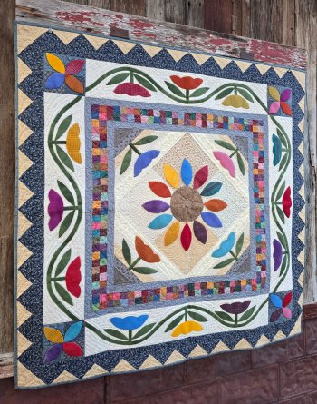 Here's a wonderful wall quilt that quite literally celebrates both sowing and sewing. Field of Flowers by Norma Whaley of Timeless Traditions is a combination of traditional piecing and wool applique. Tiny patchwork is sprinkled like seeds in a furrow while wool tulips bloom in rows. It's a folk art garden of color, again in reproduction fabrics. Marianne Michaels hand-dyed the wools and pieced this 48" square beauty. She has kits ready for you! Custom quilting by Ramona Sorensen highlights the applique and gives each border the attention it deserves.