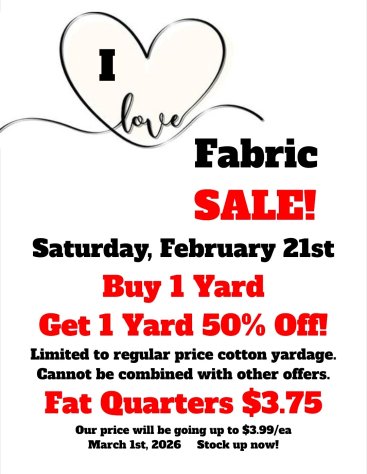 I Love Fabric, and so do you! So, let's have a sale! Next Saturday, February 21st we're having an I Love Fabric Sale. Buy 1 yard of any regular price quilter's cotton and get another yard half-off! Pick up those prints you've had your eye on, find the perfect backing, spoil yourself with some serious yardage on sale! Minimum one-yard cuts. This discount cannot be combined with other offers and is available in-store only. We'll have extra team members on hand to help you so come see us next Saturday!